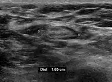 Lymphadenopathy of the axillary lymph nodes can be defined as solid nodes measuring more than 15 mm without fatty hilum.[36] Axillary lymph nodes may be normal up to 30 mm if consisting largely of fat.[36]