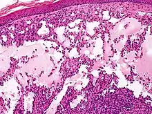 Microscopically, the vesicles in lymphangioma circumscriptum are greatly dilated lymph channels that cause the papillary dermis to expand. They may be associated with acanthosis and hyperkeratosis. There are many channels in the upper dermis which often extend to the subcutis (the deeper layer of the dermis, containing mostly fat and connective tissue). The deeper vessels have large calibers with thick walls which contain smooth muscle. The lumen is filled with lymphatic fluid, but often contains red blood cells, lymphocytes, macrophages, and neutrophils. The channels are lined with flat endothelial cells. The interstitium has many lymphoid cells and shows evidence of fibroplasia (the formation of fibrous tissue). Nodules (A small mass of tissue or aggregation of cells) in cavernous lymphangioma are large, irregular channels in the reticular dermis and subcutaneous tissue that are lined by a single layer of endothelial cells. Also an incomplete layer of smooth muscle also lines the walls of these channels. The stroma consists of loose connective tissue with a lot of inflammatory cells. These tumors usually penetrate muscle. Cystic hygroma is indistinguishable from cavernous lymphangiomas on histology.[4]