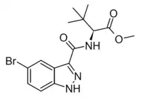MDMB-5Br-INACA is an indazole-3-carboxamide derivative which has been sold as a designer drug.[1] Surprisingly it appears to produce psychoactive activity despite the lack of a "tail" group at the indazole 1-position, but is of relatively low potency and has been encountered being misrepresented as other illicit drugs such as MDMA.[2]