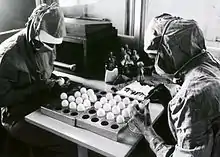 Two workers make openings in chicken eggs in preparation for a measles vaccine