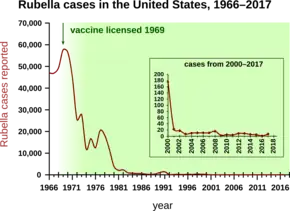 Before the widespread use of a vaccine against measles, rates of disease were so high that infection was felt to be "as inevitable as death and taxes."[24] Reported cases of measles in the United States fell from hundreds of thousands to tens of thousands per year following introduction of the vaccine in 1963. Increasing uptake of the vaccine following outbreaks in 1971, and 1977, brought this down to thousands of cases per year in the 1980s. An outbreak of almost 30,000 cases in 1990 led to a renewed push for vaccination and the addition of a second vaccine to the recommended schedule. Fewer than 200 cases have been reported in the US each year between 1997 and 2013, and the disease is no longer considered endemic there.[25][26][27]
