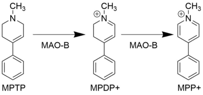 MPP+ arises in the body as the toxic metabolite of the closely related compound MPTP. MPTP is converted in the brain into MPP+ by the enzyme MAO-B, ultimately causing parkinsonism in primates by killing certain dopamine-producing neurons in the substantia nigra. The ability for MPP+ to induce Parkinson's disease has made it an important compound in Parkinson's research since this property was discovered in 1983.[2][3]