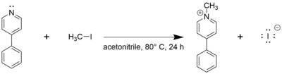 MPP+ can be readily synthesized in the laboratory, with Zhang and colleagues publishing a representative synthesis in 2017.[8] The synthesis involves reacting 4-phenylpyridine with methyl iodide in acetonitrile solvent at reflux for 24 hours.[8] An inert atmosphere is used to ensure a quantitative yield.[8] The product is formed as the iodide salt, and the reaction proceeds via an SN2 pathway.[8] The industrial synthesis of MPP+ for sale as the herbicide cyperquat used methyl chloride as the source of the methyl group.