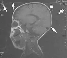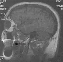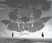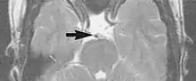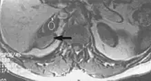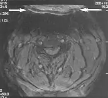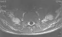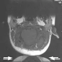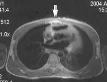 An MRI artifact is a visual artifact (an anomaly seen during visual representation) in magnetic resonance imaging (MRI). It is a feature appearing in an image that is not present in the original object.[1] Many different artifacts can occur during MRI, some affecting the diagnostic quality, while others may be confused with pathology. Artifacts can be classified as patient-related, signal processing-dependent and hardware (machine)-related.[1]