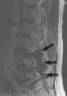 Gibbs artifacts or Gibbs ringing artifacts, also known as truncation artifacts are caused by the under-sampling of high spatial frequencies at sharp boundaries in the image.[5][6] Lack of appropriate high-frequency components leads to an oscillation at a sharp transition known as a ringing artifact. It appears as multiple, regularly spaced parallel bands of alternating bright and dark signal that slowly fade with distance (Fig. 8). Ringing artifacts are more prominent in smaller digital matrix sizes.[1] Methods employed to correct Gibbs artifact include filtering the k-space data prior to Fourier transform, increasing the matrix size for a given field of view, the Gegenbauer reconstruction and Bayesian approach.[1] ==Machine/hardware-related artifacts== This is a wide and still expanding subject. Only a few common artifacts are recognised.[1]