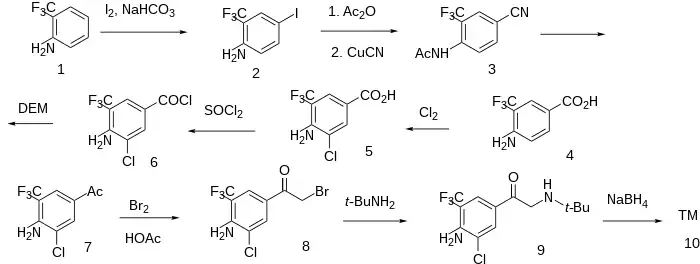 The halogenation of 2-(Trifluoromethyl)aniline [88-17-5] (1) with iodine and sodium bicarbonate resulted in 2-Amino-5-Iodobenzotrifluoride [97760-97-9] (2). Protection with acetic anhydride followed by nucleophilic aromatic displacement with copper(I)cyanide gave N-[4-cyano-2-(trifluoromethyl)phenyl]acetamide [175277-96-0] (3). Hydrolysis of the nitrile and the protecting group gave 4-amino-3-(trifluoromethyl)benzoic acid [400-76-0] (4). Halogenation with chlorine gave 4-Amino-3-Chloro-5-(Trifluoromethyl)Benzoic Acid [95656-52-3] (5). Halogenation of the acid with thionyl chloride gave 4-Amino-3-chloro-5-(trifluoromethyl)benzoylchloride [63498-15-7] (6). Treatment with diethyl malonate [105-53-3] gave the acetophenone and hence 1-[4-amino-3-chloro-5-(trifluoromethyl)phenyl]ethanone [97760-76-4] (7). Halogenation with bromine in acetic acid led to 1-[4-amino-3-chloro-5-(trifluoromethyl)phenyl]-2-bromoethanone [97760-87-7] (8). Treatment with tert-butylamine [75-64-9] yielded 1-[4-amino-3-chloro-5-(trifluoromethyl)phenyl]-2-(tert-butylamino)ethenone, CID:13355601 (9). Reduction of the ketone with sodium borohydride completed the synthesis of Mabuterol (10).