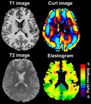 ![]() Magnetic resonance elastography of the brain. A T1 weighted anatomical image is shown in the top-left, and the corresponding T2 weighted image from the MRE data is shown in the bottom-left. The wave image used to make the elastogram is shown in the top-right, and the resulting elastogram is in the bottom-right. | |