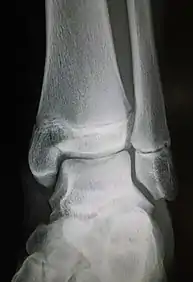 Ankle radiographs are used to detect widening of the tibiofibular syndesmosis or medial clear space. The medial clear space is the area between the talus of the ankle and the medial malleolus. Damage to the deltoid ligament and syndesmotic ligaments result in mortise instability, causing the talus to laterally shift and widen the medial clear space.[4][12] A clinical study, conducted in 2006 and published in the Journal of Bone and Joint Surgery, found that the medial clear space size of a normal ankle and an injured ankle measured at 4 millimetres and 5.4 millimetres in length respectively.[11] To confirm diagnosis, full-leg radiographs are used to inspect for fractures of the proximal fibula and widening of the interosseous clear space (or tibiofibular clear space). The interosseous clear space is the area between the medial side of the fibula and lateral side of the tibia. A peer-reviewed study, published in Injury in 2004, found that an interosseous clear space greater than 10 millimetres indicates diastasis of the syndesmotic ligaments.[4]