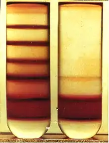 To achieve synchronization and/or concentration of the parasites in culture several methods have been developed. A discontinuous Percoll gradient procedure can be used to isolate infected red blood cells because red cells containing plasmodia are less dense than normal ones. Young trophozoites coincided with erythrocytes in a broad band corresponding to densities from 1.075 to 1.100 g/ml, whereas schizonts were concentrated at a density approximating 1.062 g/ml.[14] There are studies, however, that suggest that some strains of P.falciparum are affected in their capacity of invasion after being exposed to this chemical. The difference between diamagnetic low-spin oxyhemoglobin in uninfected red blood cells and paramagnetic hemozoin in infected red blood cells can also be used for isolation. Magnetic columns have shown to be less harmful for the parasite and are simple and adjustable to the needs of the researcher.[15][16] The column is mounted in a potent magnet holder and the culture flowed through it. The column traps the erythrocytes infected with the latest stages of the parasites, which can then be eluted when the column is removed from the magnet. It is a simple method that does not need expensive equipment and it does not seem to affect the parasites as to their invasion capabilities afterwards.[12]