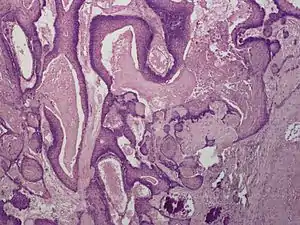 Proliferating trichilemmal cysts (also known as a "Pilar tumor", "Proliferating follicular cystic neoplasm", "Proliferating pilar tumor", and "Proliferating trichilemmal tumor"[2]) are a cutaneous condition characterized by proliferations of squamous cells forming scroll-like structures.[2][3]: 678
