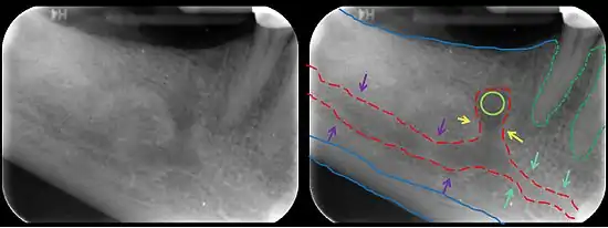 Several variations of the mandibular canal exist with varying frequency. The most common variant is the retromolar canal (~10 % of canals), whereby a branch is given off in the mandibular ramus which terminates in the retromolar region of the mandible. The retromolar canal may cause bleeding during surgery in the retromolar region such as removal of mandibular third molar teeth. Other variants include a bifid canal with a branch: following the course of the main mandibular canal before re-joining it (forward or buccolingual type); terminating at the apex of a tooth, usually the molar teeth (dental type); opening as an accessory mental foramen.[3] A trifid mandibular canal variation has also been described.[4][5]