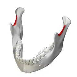 The mandibular notch, also known as the sigmoid notch, is a groove in the ramus of the mandible. It is the gap between the coronoid process anteriorly and the condyloid process posteriorly.
