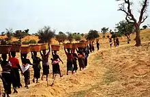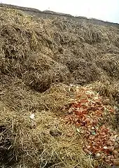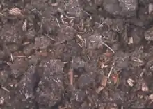 Most animal manure consists of feces. Common forms of animal manure include farmyard manure (FYM) or farm slurry (liquid manure).[2] FYM also contains plant material (often straw), which has been used as bedding for animals and has absorbed the feces and urine. Agricultural manure in liquid form, known as slurry, is produced by more intensive livestock rearing systems where concrete or slats are used, instead of straw bedding. Manure from different animals has different qualities and requires different application rates when used as fertilizer. For example horses, cattle, pigs, sheep, chickens, turkeys, rabbits, and guano from seabirds and bats all have different properties.[3] For instance, sheep manure is high in nitrogen and potash, while pig manure is relatively low in both. Horses mainly eat grass and a few weeds so horse manure can contain grass and weed seeds, as horses do not digest seeds the way that cattle do. Cattle manure is a good source of nitrogen as well as organic carbon.[4] Chicken litter, coming from a bird, is very concentrated in nitrogen and phosphate and is prized for both properties.[4][5]