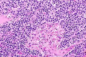 Primary salivary gland EMZL (also termed MALT lymphoma of the salivary glands) or, in cases primarily involving the lacrimal glands, primary lacrimal gland EMZL (also termed MALT lymphoma of the lacrimal gland) is a complication of Sjögren syndrome, an autoimmune disease characterized by chronic inflammation of the salivary and/or lacrimal glands.[17] This autoimmune disease is thought to be caused by a combination of genetic and environmental factors including infectious agents. This lymphoma affects ~3% of patients with Sjögren syndrome[8] and involves one or more of the affected salivary or, less commonly, lacrimal glands.[17] The median time between diagnosis of the autoimmune disease and EMZL varies between 7.5[17] and 11 years.[19] Affected individuals typically are 55–60 years old and present with localized hardening and/or enlargement of the parotid gland or, less commonly, other salivary or lacrimal gland. Some 20% of cases present with or progress to involve local lymph nodes or the spleen to cause lymphadenopathy or splenomegaly while ~10% of cases present with or progress to a high-grade lymphoma, primarily diffuse large B-cell lymphoma.[17] Histologically, the involved glands show lymphocyte-based lesions that are typical of EMZL with the infiltrating lymphocytes in some cases having morphological features resembling plasma cells. In individuals with more advanced disease, these lesions develop in the mucosal linings of the eye socket, nasal cavity, pharynx, airways of the lower respiratory tract, stomach, and/or thyroid gland.[8]