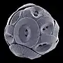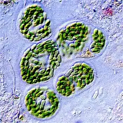 Protists are highly diverse organisms currently organised into 18 phyla, but are not easy to classify.[92][93] Studies have shown high protist diversity exists in oceans, deep sea-vents and river sediments, suggesting a large number of eukaryotic microbial communities have yet to be discovered.[94][95] There has been little research on mixotrophic protists, but recent studies in marine environments found mixotrophic protests contribute a significant part of the protist biomass.[90] Since protists are eukaryotes they possess within their cell at least one nucleus, as well as organelles such as mitochondria and Golgi bodies. Protists are asexual but can reproduce rapidly through mitosis or by fragmentation.