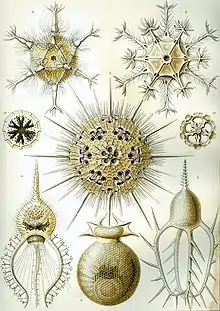 Radiolarian protist as drawn by Haeckel | Foraminiferans, and some marine amoebae, ciliates and flagellates. | |||