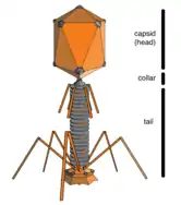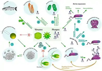 Bacteriophages, often just called phages, are viruses that parasite bacteria and archaea. Marine phages parasite marine bacteria and archaea, such as cyanobacteria.[40] They are a common and diverse group of viruses and are the most abundant biological entity in marine environments, because their hosts, bacteria, are typically the numerically dominant cellular life in the sea. Generally there are about 1 million to 10 million viruses in each mL of seawater, or about ten times more double-stranded DNA viruses than there are cellular organisms,[41][42] although estimates of viral abundance in seawater can vary over a wide range.[43][44] For a long time, tailed phages of the order Caudovirales seemed to dominate marine ecosystems in number and diversity of organisms.[40] However, as a result of more recent research, non-tailed viruses appear to be dominant in multiple depths and oceanic regions, followed by the Caudovirales families of myoviruses, podoviruses, and siphoviruses.[45] Phages belonging to the families Corticoviridae,[46] Inoviridae,[47] Microviridae,[48] and Autolykiviridae[49][50][51][52] are also known to infect diverse marine bacteria.