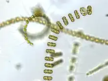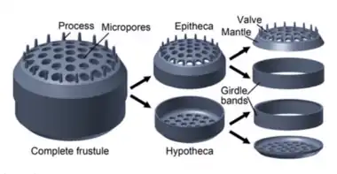 Diatoms have glass like cell walls made of silica and called frustules.[97]