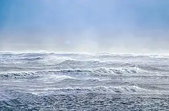 A stream of airborne microorganisms circles the planet above weather systems but below commercial air lanes.[17] Some peripatetic microorganisms are swept up from terrestrial dust storms, but most originate from marine microorganisms in sea spray. In 2018, scientists reported that hundreds of millions of viruses and tens of millions of bacteria are deposited daily on every square meter around the planet.[18][19]