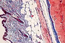 Masson's trichrome stain of rat airway. Connective tissue is stained blue, nuclei are stained dark red/purple, and cytoplasm is stained red/pink.