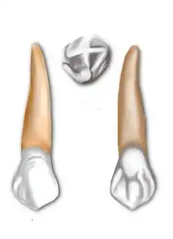 In human dentistry, the maxillary canine is the tooth located laterally (away from the midline of the face) from both maxillary lateral incisors of the mouth but mesial (toward the midline of the face) from both maxillary first premolars. Both the maxillary and mandibular canines are called the "cornerstone" of the mouth because they are all located three teeth away from the midline, and separate the premolars from the incisors. The location of the canines reflects their dual function as they complement both the premolars and incisors during mastication, commonly known as chewing. Nonetheless, the most common action of the canines is tearing of food. The canines often erupt in the upper gums several millimeters above the gum line. The canine teeth are able to withstand the tremendous lateral pressure caused by chewing. There is a single cusp on canines, and they resemble the prehensile teeth found in carnivorous animals such as the extinct saber-toothed cat. Though relatively the same, there are some minor differences between the deciduous (baby) maxillary canine and that of the permanent maxillary canine.