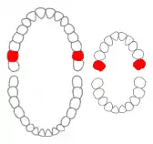 ![]() Maxillary second molars of permanent and primary teeth marked in red. | |