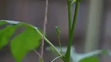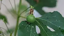The fleshy fruit, also referred to as a maypop, is an oval yellowish berry about the size of a hen egg; it is green, though it may become yellow-green to yellow-orange as it matures. Like other passifloras, the pulp is gelatinous and encases the seeds. The color of the pulp is originally white and becomes a dull yellow when ripe. The seeds are black and approximately 5 mm in size. As with other passifloras, it is the larval food of a number of lepidoptera species, including the zebra longwing, the Gulf fritillary, the crimson-patched longwing, the Julia, the Plebeian sphinx, and the variegated fritillary.[3] In many cases its fruit is very popular with wildlife. The egg-shaped green fruits 'may pop' when stepped on. This phenomenon gives the P. incarnata its common name, as well as the fact that its roots can remain dormant for most of the winter underground and then the rest of the plant "pops" out of the ground by May, unharmed by the snow.