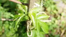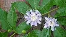 The stems can be smooth or pubescent; they are long and trailing, possessing many tendrils. Leaves are alternate and palmately 3-lobed and occasionally 5-lobed, measuring 6–15 centimetres (2.4–5.9 in). They have two characteristic glands at the base of the blade on the petiole that secrete drops of sweet nectar. Flowers have five bluish-white petals. They exhibit a white and purple corona, a structure of fine appendages between the petals and stamens. The large flower is typically arranged in a ring above the petals and sepals. They are pollinated by insects such as bumblebees and carpenter bees, and are self-sterile. The flower normally begins to bloom in July.[2]