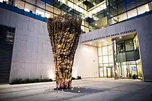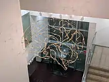 Schwerpunkt (German for "Center of mass or gravity") is a sculpture by Ralph Helmick. The sculpture consists of one hundred 3D printed metal neurons suspended above the McGovern Institute lobby. When viewed from a specific focal point on the building's third floor atrium, the neurons take on the shape of a human brain.[6][7]
