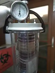 McIntosh and Fildes' anaerobic jar is an instrument used in the production of an anaerobic environment. This method of anaerobiosis as others is used to culture bacteria which die or fail to grow in presence of oxygen (anaerobes).[1][2] It was originally introduced by James McIntosh, Paul Fildes and William Bulloch in 1916.[3] McIntosh and Fildes, after whom the device has been named, published an improved version in 1921.[4]