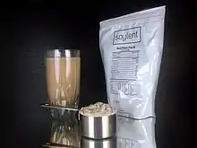 A meal replacement is a drink, bar, soup, etc. intended as a substitute for a solid food, usually with controlled quantities of calories and nutrients. Some drinks come in powdered form or pre-mixed health shakes that can be cheaper than solid foods with identical health qualities. Medically prescribed meal replacement drinks include the body's necessary vitamins and minerals.[1] Bodybuilders sometimes use meal replacements, not formulated for weight loss, to save food preparation time when eating 5-6 meals a day.[2]