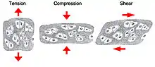 The balance that is struck between anabolic and catabolic processes is strongly influenced by the type of loading that cartilage experiences. High strain rates (such as which occurs during impact loading) cause tissue damage, degradation, decreased matrix production and apoptosis.[22][23] Decreased mechanical loading over long periods, such as during extended bed-rest, causes a loss of matrix production.[24] Static loads have been shown to be detrimental to biosynthesis[25] while oscillatory loads at low frequencies (similar that of a normal walking gait) have been shown to be beneficial in maintaining health and increasing matrix synthesis.[26] Due to the complexity of in-vivo loading conditions and the interplay of other mechanical and biochemical factors, the question of what an optimal loading regimen may be or whether one exists remain unanswered.