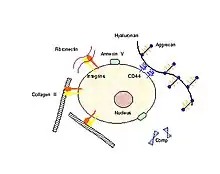 In order for mechanical signals to be sensed, there need to be mechanoreceptors on the surface of chondrocytes. Candidates for chondrocyte mechanoreceptors include stretch-activated ion channels (SAC),[27] the hyaluronan receptor CD44, annexin V (a collagen type II receptor),[28] and integrin receptors (of which there exist several types on chondrocytes).