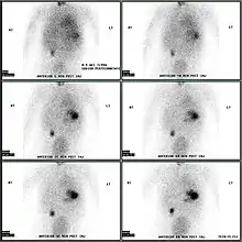 A technetium-99m (99mTc) pertechnetate scan, also called Meckel scan or nuclear scintigraphy scan, is the investigation of choice to diagnose Meckel's diverticula in children. This scan detects gastric mucosa; since approximately 50% of symptomatic Meckel's diverticula have ectopic gastric or pancreatic cells contained within them,[24] this is displayed as a spot on the scan distant from the stomach itself. In children, this scan is highly accurate and noninvasive, with 95% specificity and 85% sensitivity;[17] however, in adults the test is only 9% specific and 62% sensitive.[25] This scan is more accurate in children because gastric mucosa is found in 90% of bleeding diverticula; which is the most common symptom in children, not adults. [26]