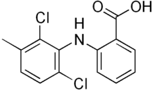 Meclofenamic acid (used as meclofenamate sodium, brand name Meclomen) is a drug used for joint, muscular pain, arthritis and dysmenorrhea.[1] It is a member of the anthranilic acid derivatives (or fenamate) class of nonsteroidal anti-inflammatory drugs (NSAIDs) and was approved by the US FDA in 1980.[2] Like other members of the class, it is a cyclooxygenase (COX) inhibitor, preventing the formation of prostaglandins.[3]