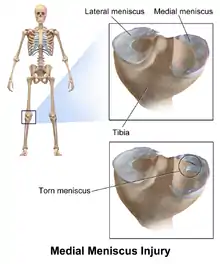 The medial meniscus is a fibrocartilage semicircular band that spans the knee joint medially, located between the medial condyle of the femur and the medial condyle of the tibia.[1] It is also referred to as the internal semilunar fibrocartilage. The medial meniscus has more of a crescent shape while the lateral meniscus is more circular. The anterior aspects of both menisci are connected by the transverse ligament. It is a common site of injury, especially if the knee is twisted.