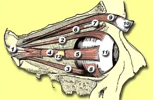 ![]() Rectus muscles: 2 = superior, 3 = inferior, 4 = medial, 5 = lateral Oblique muscles: 6 = superior, 8 = inferior Other muscle: 9 = levator palpebrae superioris Other structures: 1 = Common tendinous ring, 7 = Trochlea, 10 = Superior tarsus, 11 = Sclera, 12 = Optic nerve | |