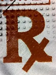 The prescription symbol, ℞, as printed on the blister pack of a prescription drug
