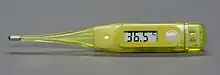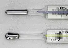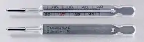 ![]() A medical/clinical mercury thermometer showing the temperature of 37.7 °C (99.9 °F) | |