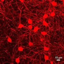Medium spiny neurons (MSNs), also known as spiny projection neurons (SPNs), are a special type of GABAergic inhibitory cell representing 95% of neurons within the human striatum, a basal ganglia structure.[1] Medium spiny neurons have two primary phenotypes (characteristic types): D1-type MSNs of the direct pathway and D2-type MSNs of the indirect pathway.[1][2][3] Most striatal MSNs contain only D1-type or D2-type dopamine receptors, but a subpopulation of MSNs exhibit both phenotypes.[1][2][3]