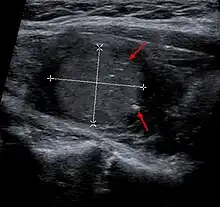 Medullary thyroid carcinoma on ultrasound with typical small calcifications (arrows)