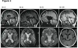 | MRI images showing megalencephaly in four family members who all have unusually large skulls (the family is affected by an autosomal recessive syndrome caused by a KIF7 mutation that induces multiple epiphyseal dysplasia)[1] | |