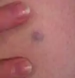 | Mongolian spot | Congenital large, deep, bluish discoloration which generally disappears by puberty. It is named for its association with East Asian ethnic groups but is not limited to them.[21] | ![]() |