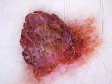| Dysplastic nevus | Usually a compound nevus with cellular and architectural dysplasia. Like typical moles, dysplastic nevi can be flat or raised. While they vary in size, dysplastic nevi are typically larger than normal moles and tend to have irregular borders and irregular coloration. Hence, they resemble melanoma, appear worrisome, and are often removed to clarify the diagnosis. Dysplastic nevi are markers of risk when they are numerous, such as in people with dysplastic nevus syndrome. According to the National Institute of Health (NIH), doctors believe that, when part of a series or syndrome of multiple moles, dysplastic nevi are more likely than ordinary moles to develop into the most virulent type of skin cancer called melanoma.[19] | ![]() In this case, the central portion is a complex papule, and the periphery is macular, irregular, indistinct and slightly pink. |
