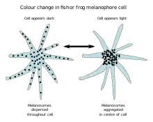 In many species of fish, amphibians, crustaceans, and reptiles, melanosomes can be highly mobile within the cell in response to hormonal (or sometimes neural) control, which leads to visible changes in colour that are used for behavioural signaling or photoprotection.
