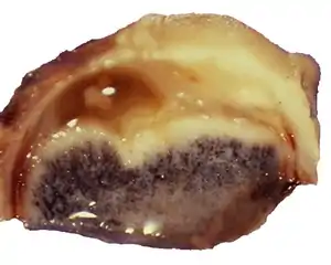 | A bone resection sample showing the pigmentation below the surface in a melanotic neuroectodermal tumor of infancy | |