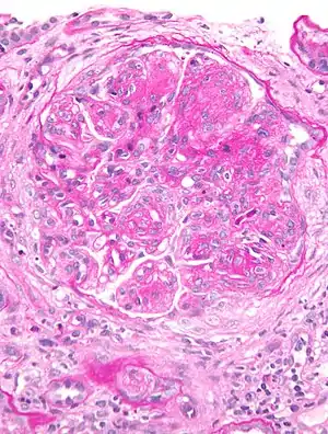 | Micrograph of glomerulus in membranoproliferative glomerulonephritis with increased mesangial matrix and increased mesangial cellularity. Kidney biopsy. PAS stain. | |