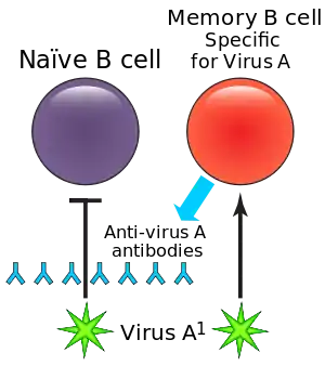 The memory B cells produced during the primary immune response are specific to the antigen involved during the first exposure. In a secondary response, the memory B cells specific to the antigen or similar antigens will respond.[3] When memory B cells reencounter their specific antigen, they proliferate and differentiate into plasma cells, which then respond to and clear the antigen.[3] The memory B cells that do not differentiate into plasma cells at this point can reenter the germinal centers to undergo further class switching or somatic hypermutation for further affinity maturation.[3] Differentiation of memory B cells into plasma cells is far faster than differentiation by naïve B cells, which allows memory B cells to produce a more efficient secondary immune response.[4] The efficiency and accumulation of the memory B cell response is the foundation for vaccines and booster shots.[4][3]