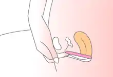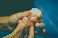 After 4–12 hours of use (depending on the amount of flow), the cup is removed by reaching up to its stem to find the base. Simply pulling on the stem is not recommended to remove the cup, as this can create suction. The base of the cup is pinched to release the seal, and the cup is removed.[6] After emptying, a menstrual cup should be rinsed or wiped and reinserted. It can be washed with a mild soap, and sterilized in boiling water for a few minutes at the end of the cycle. Alternatively, sterilizing solutions (usually developed for baby bottles and breast pump equipment) may be used to soak the cup. Specific cleaning instructions vary by brand.