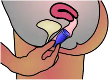 The menstrual cup is first folded or pinched and then inserted into the vagina. It will normally unfold automatically and create a light seal against the cervix. In some cases, the user may need to twist the cup or flex the vaginal muscles to ensure the cup is fully open. If correctly inserted, the cup should not leak or cause any discomfort.[6] The stem should be completely inside the vagina. If it is not, the stem can be trimmed. There are various folding techniques for insertion; common folds include the c-fold, as well as the punch-down fold.[7]